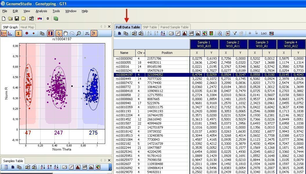 This file can be easily extracted from GenomeStudio once we have created the project and all the samples that we want to analyze have been processed and included in it. The GenomeStudio project window should look like below and, from now on, we will be working over the tab “Full Data Table”: