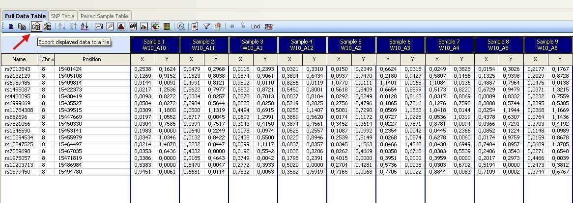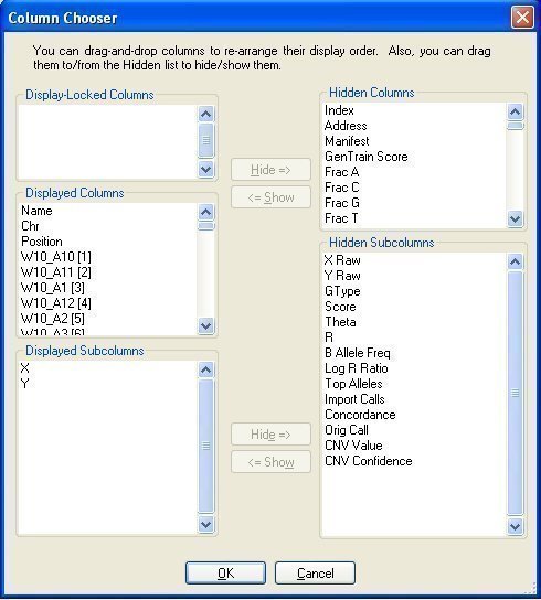 The first step consists of selecting the appropriate fields that will be shown in the table. For doing this click the “Column chooser” button inside the “Full Data Table” tab, include the fields “X” and “Y” in the “Displayed Subcolumns” box and the fields “Name”, “Chr” and “Position” together with all the sample IDs that we want to analyze in the “Displayed Columns” box: