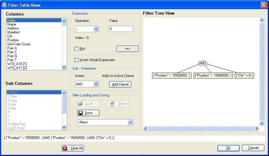 If we only want to analyze one genome region, we can use the button “Filter rows”. In our case, we have selected the chromosome 8 region 15,400,000-15,500,000 as you can see in the figure below.